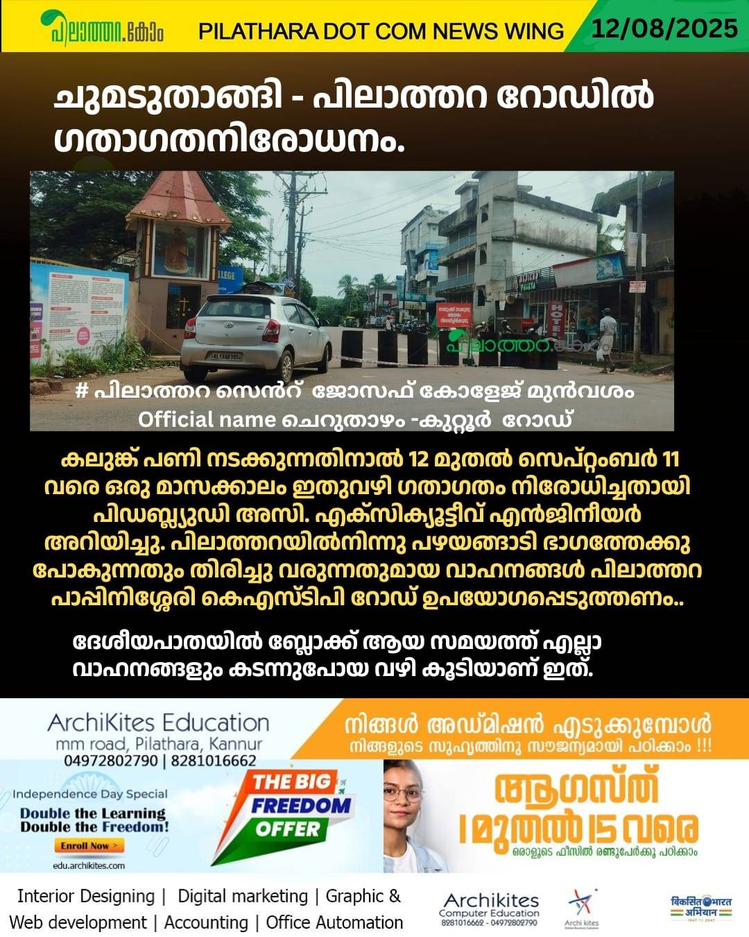 ചുമടുതാങ്ങി - പിലാത്തറ റോഡിൽ കലുങ്ക് പണി നടക്കുന്നതിനാൽ ആഗസ്റ്റ് 12 മുതൽ സെപ്റ്റംബർ 11 വരെ ഗതാഗതം നിരോധിച്ചതായി പിഡബ്ല്യുഡി