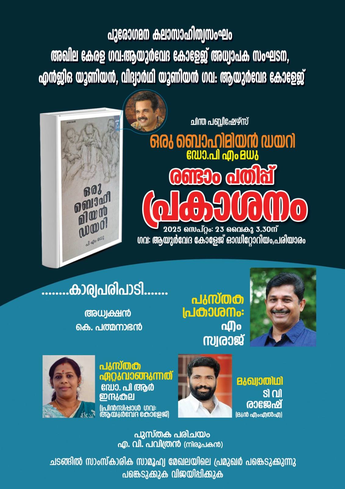 2025 സെപ്റ്റം: 23 വൈകു 3.30ന് പരിയാരം ഗവ: ആയുർവേദ കോളേജ് ഓഡിറ്റോറിയത്തിൽ എം സ്വരാജ് പുസ്തക പ്രകാശനം നിർവഹിക്കും.