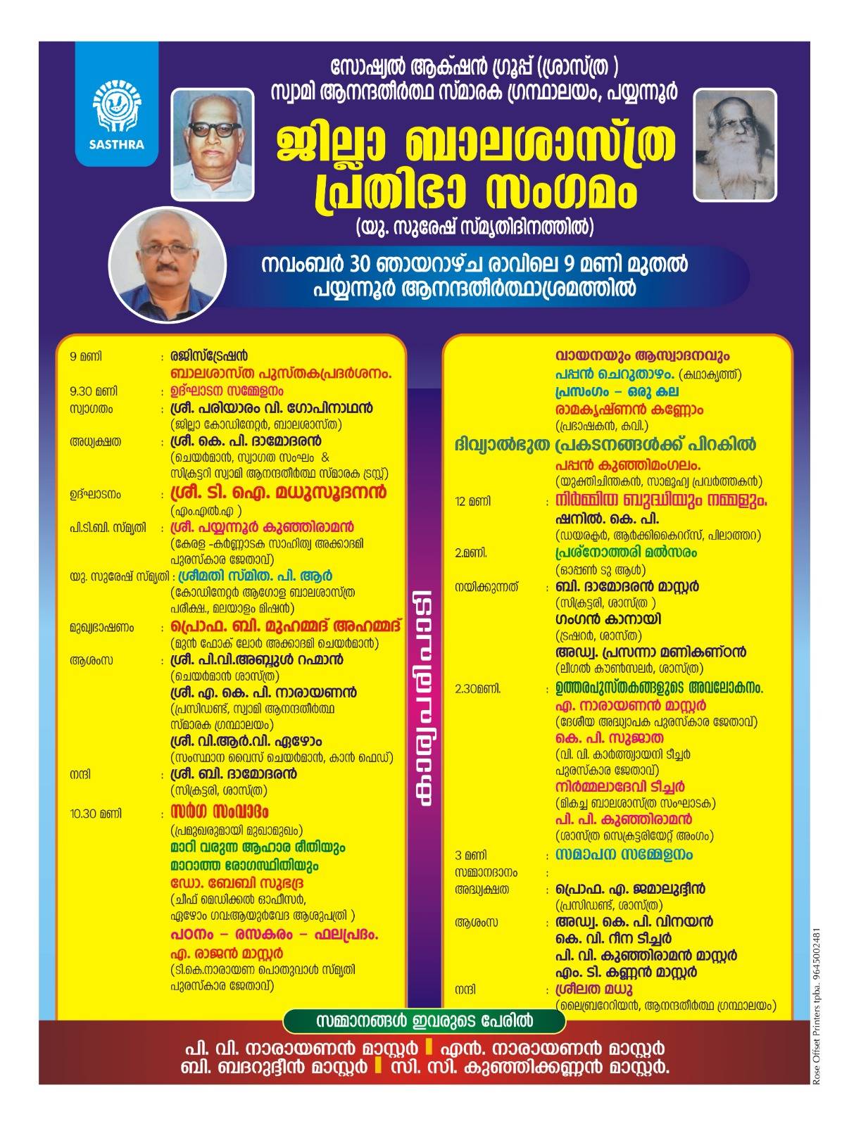 സോഷ്യൽ ആക്ഷൻഗ്രൂപ്പ് (ശാസ്ത്ര ) സ്വാമി ആനന്ദതീർത്ഥ സ്മാരക ഗ്രന്ഥാലയം, പയ്യന്നൂർ ജില്ലാ ബാലശാസ്ത്ര പ്രതിഭാ സംഗമം നവമ്പർ 30ന്ഞായർ ( യു. സുരേഷ് സ്മൃതിദിനത്തിൽ) പയ്യന്നൂർ ആനന്ദതീർത്ഥാ ശ്രമത്തിൽ നടക്കും. വിവിധ വിഷയങ്ങളിൽ ട്രെയിനിങ് പ്രോഗ്രാമുകൾ നടക്കും.