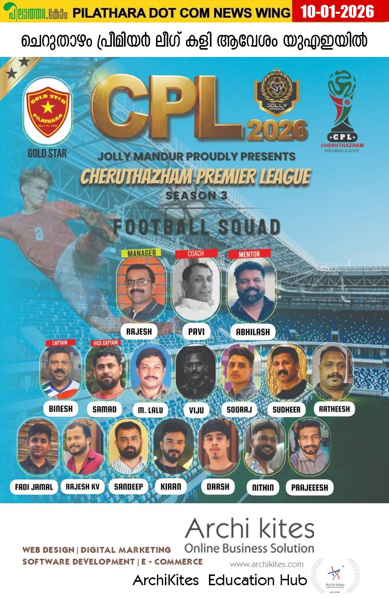കേരളത്തിൽ മികച്ച പ്രതികരണം നേടിയ CPL മത്സരങ്ങളുടെ ആവേശം വിദേശരാജ്യമായ യുഎഇയിലേക്കും വ്യാപിക്കുകയാണ് . ക്രിക്കറ്റ്, ഫുട്ബോൾ മത്സരങ്ങളടങ്ങിയ ഈ ടൂർണമെന്റിൽ വിവിധ ടീമുകൾ മാറ്റുരയ്ക്കും. ഫുട്ബോൾ വിഭാഗത്തിൽ പിലാത്തറയെ പ്രതിനിധീകരിച്ച് ‘പിലാത്തറ ഗോൾഡ്സ്റ്റർ’ ടീം മത്സരത്തിൽ പങ്കെടുക്കും. ചെറുതാഴം പ്രീമിയർ ലീഗിന് പിലാത്തറയിലെ കായികപ്രേമികളുടെയും, പിലാത്തറഡോട്കോമിൻ്റെയും ആശംസകൾ നേരുന്നു.