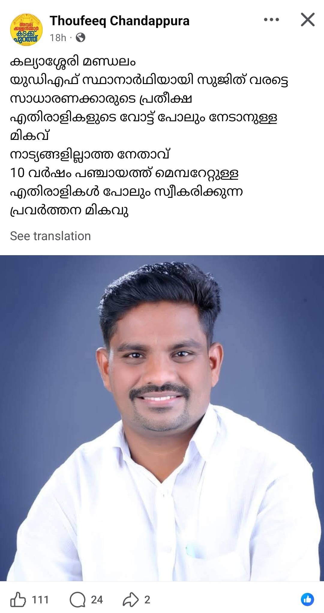 അതുകൊണ്ടുതന്നെയാണ്, കല്യാശ്ശേരി മണ്ഡലത്തിലെ വലിയൊരു വിഭാഗം ജനങ്ങളും പ്രവർത്തകരും യുഡിഎഫ് സ്ഥാനാർത്ഥിയായി സുജിത്തിനെ നിയമസഭയിലേക്ക് അയക്കണം എന്ന ആവശ്യവുമായി മുന്നോട്ട് വരുന്നത്.