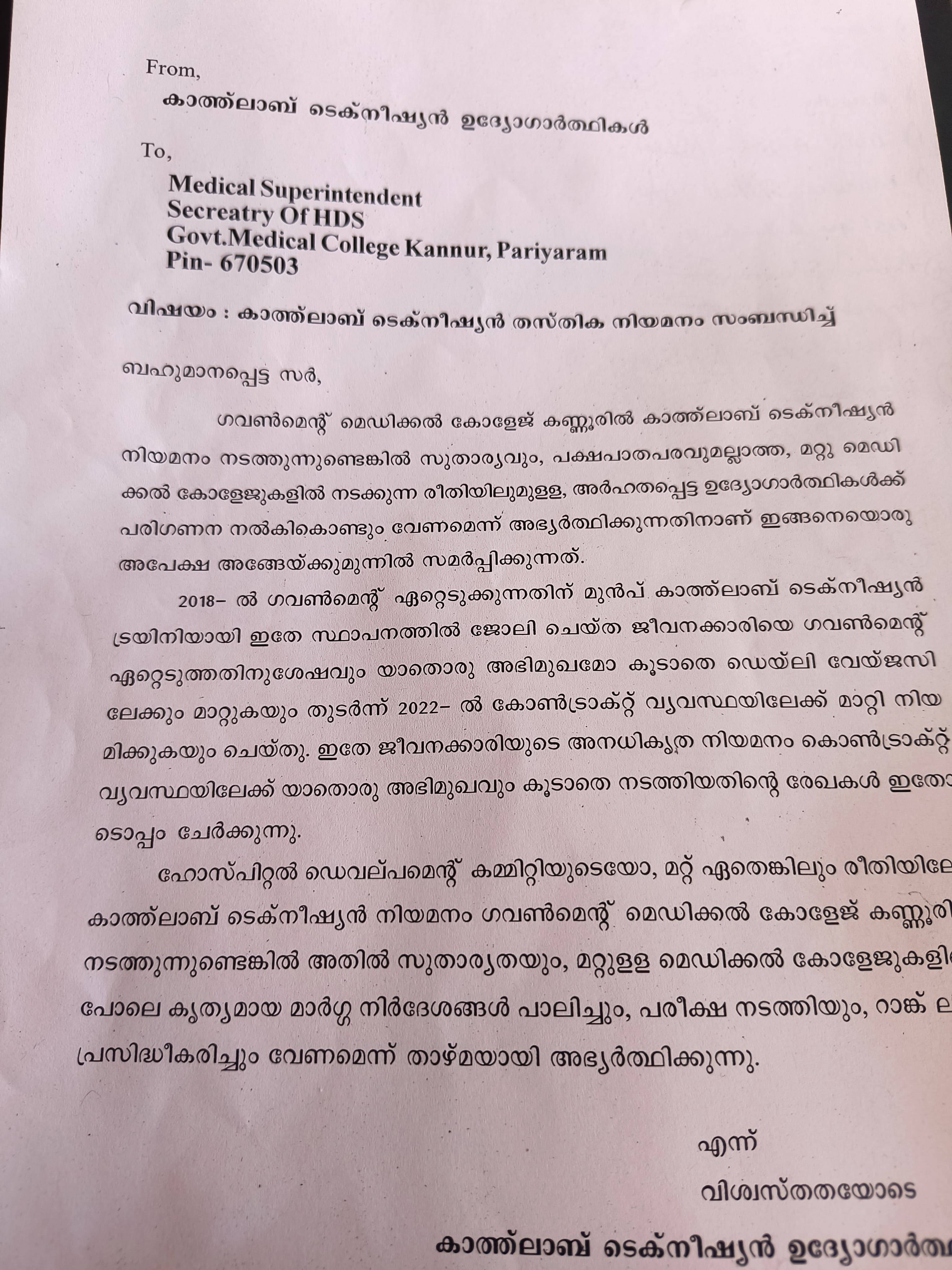 ഗവ മെഡിക്കൽ കോളേജ് പരിയാരം കാത്ത് ലാബ് ടെക്നീഷ്യൻ നിയമനത്തിൽ മാനദണ്ഡങ്ങൾ ലംഘിച്ച് പിൻവാതിൽ നിയമനം നടത്താൻ ശ്രമിക്കുന്നതായി ആരോപണം.