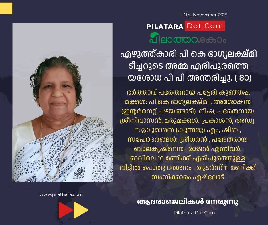 എഴുത്ത്കാരി പി കെ ഭാഗ്യലക്ഷ്മി ടീച്ചറുടെ അമ്മ എരിപുരത്തെ യശോധ പി പി അന്തരിച്ചു.