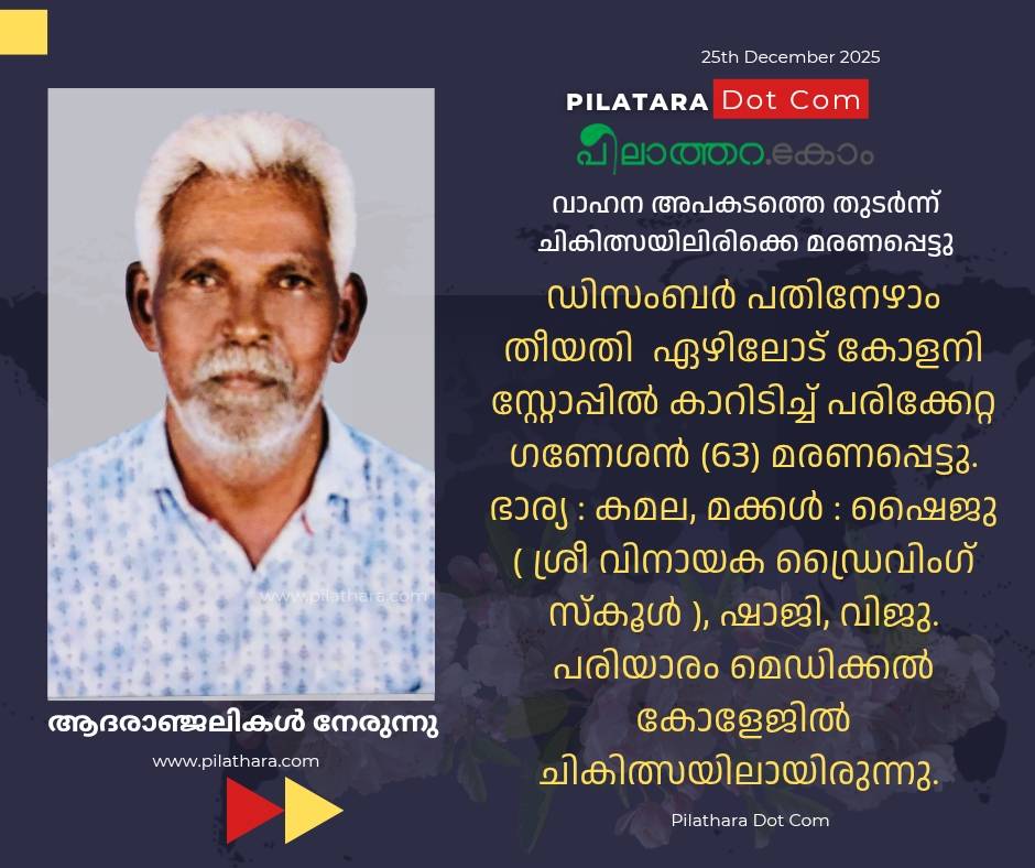 ഡിസംബർ പതിനേഴാം തീയതി രാത്രി 7 മണിയോടെ ഏഴിലോട് കോളനി സ്റ്റോപ്പിൽ കാറിടിച്ച് പരിക്കേറ്റ ഗണേശൻ (63) മരണപ്പെട്ടു.