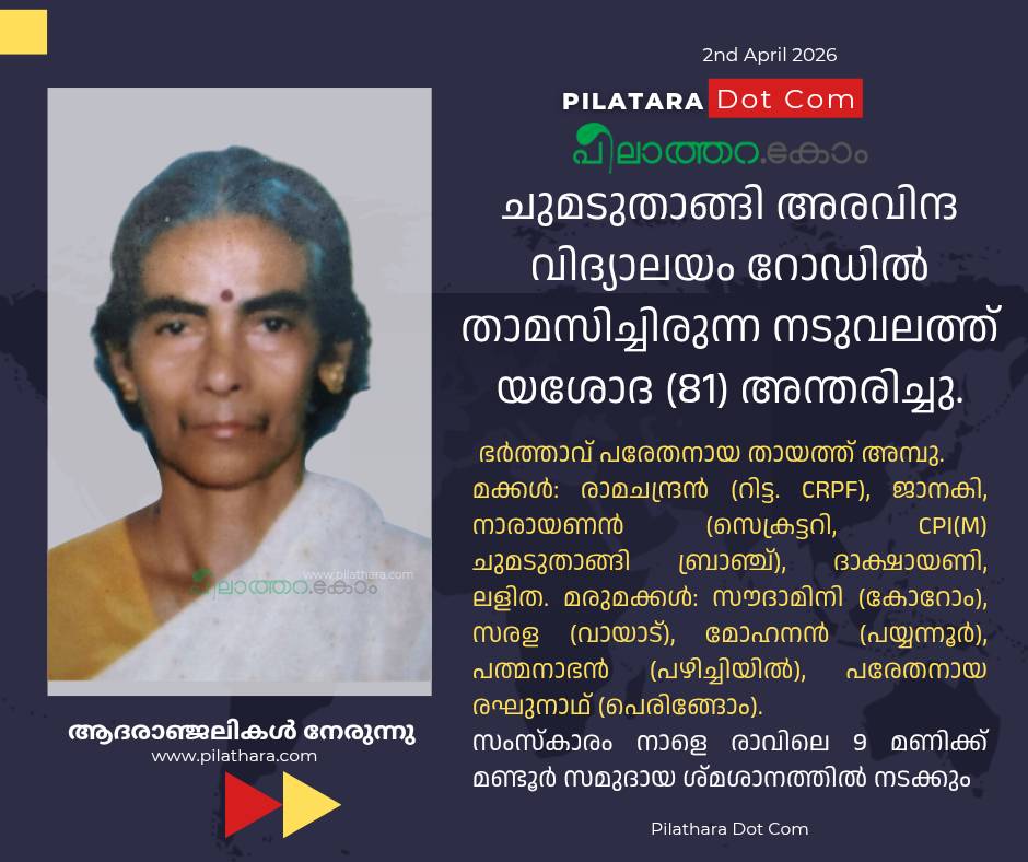 ചുമടുതാങ്ങി അരവിന്ദ വിദ്യാലയം റോഡിൽ താമസിച്ചിരുന്ന നടുവലത്ത് യശോദ (81) അന്തരിച്ചു. ഭർത്താവ് പരേതനായ തായത്ത് അമ്പു.